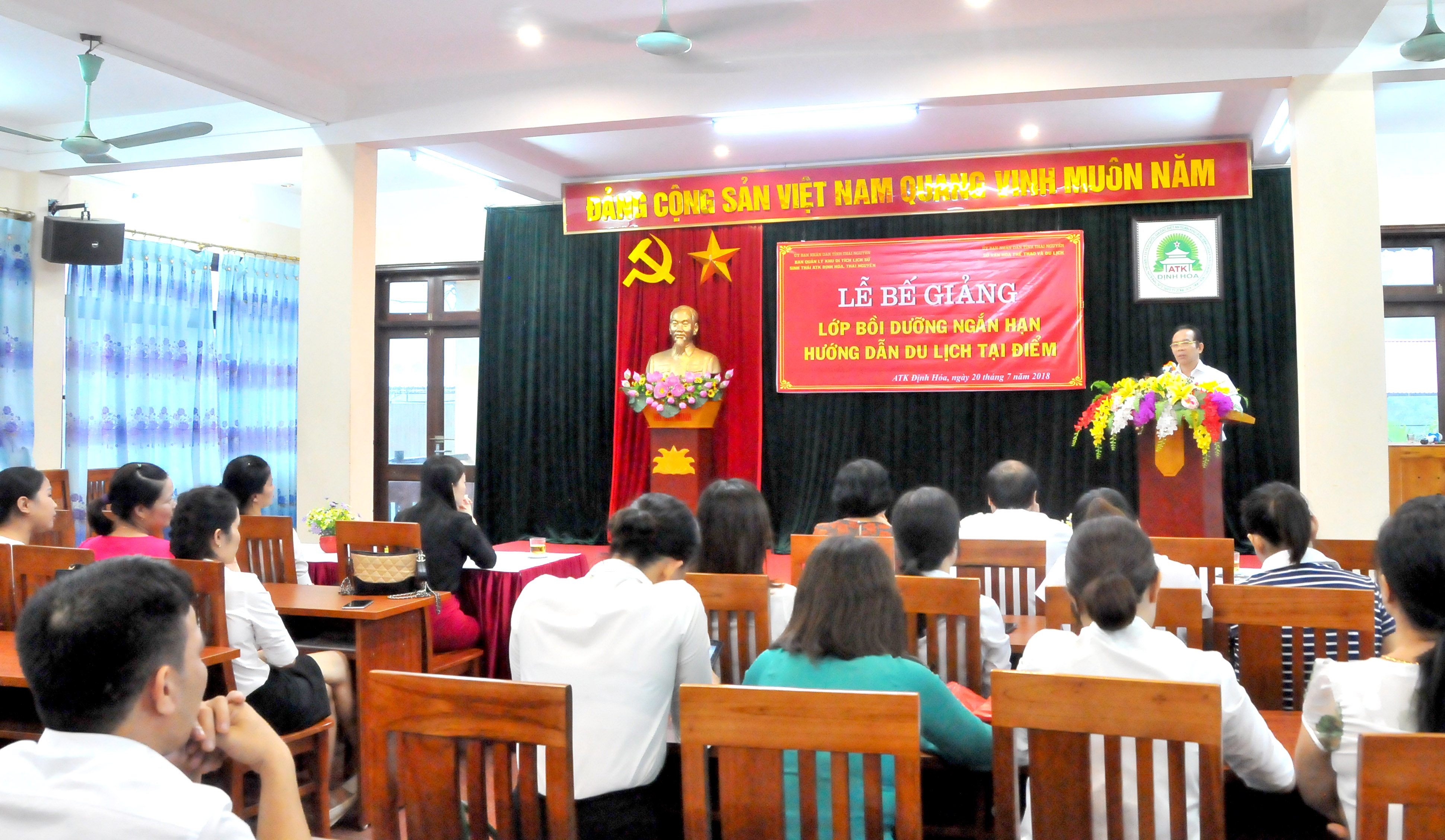 (ATK – ĐH) – Chiều ngày 20/7/2018, tại Hội trường Ban quản lý Khu di tích Lịch sử – Sinh thái ATK Định Hóa, Thái Nguyên, Lễ Bế giảng Lớp bồi dưỡng Hướng dẫn du lịch tại điểm được tổ chức.